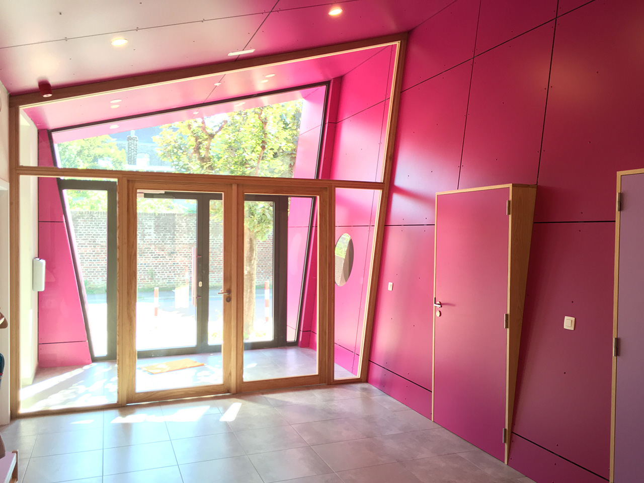 Extension et transformation d’une crèche à Visé. Le Nid de Boutchou est installé dans les bâtiments de l’ancienne école auxquels une nouvelle aile vitrée et décorée de dessins d’enfants a été ajoutée. Cela donne un ensemble très fonctionnel et très coloré.